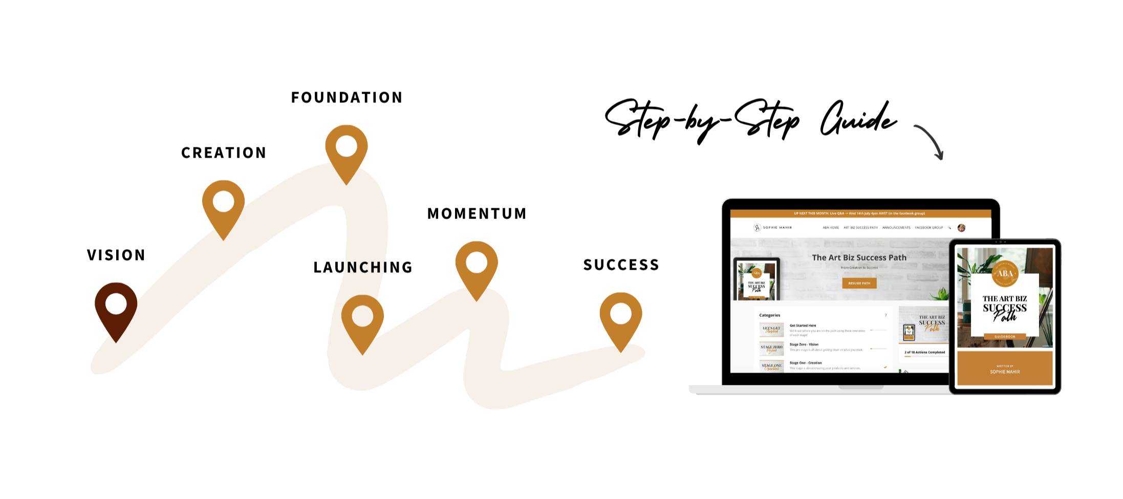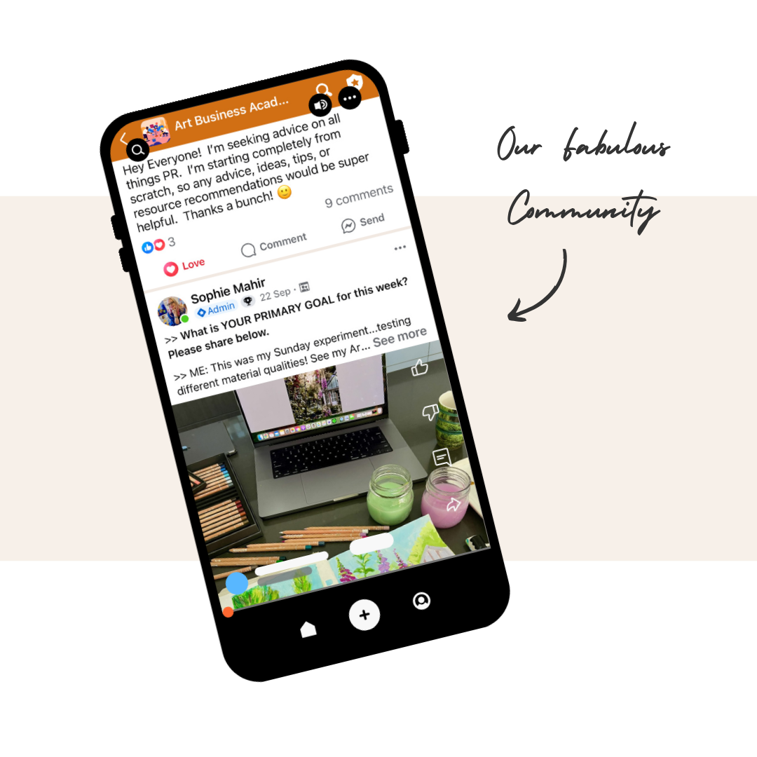 A vibrant online community for artists, packed with coaching, Q&A calls, training videos, and ready-to-use templates, all built around a simple 6-step path to grow your art business.